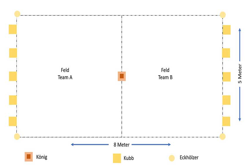 Nachdem sich zwei Teams gebildet haben, wird auf einer ebenen Fläche von 5 x 8 Metern jeweils die Ecke mit einem der vier Eckhölzer markiert. Die Spielfeldgröße kann aber auch nach Belieben vergrößert werden – dies erhöht auf jeden Fall den Schwierigkeitsgrad! Jeweils auf einer Grundlinie platziert sich ein Team und stellt ihre fünf Kubbs in gleichem Abstand auf. Der König wird genau in die Mitte des Spielfeldes gestellt. Jedes Team erhält 6 Wurfhölzer.